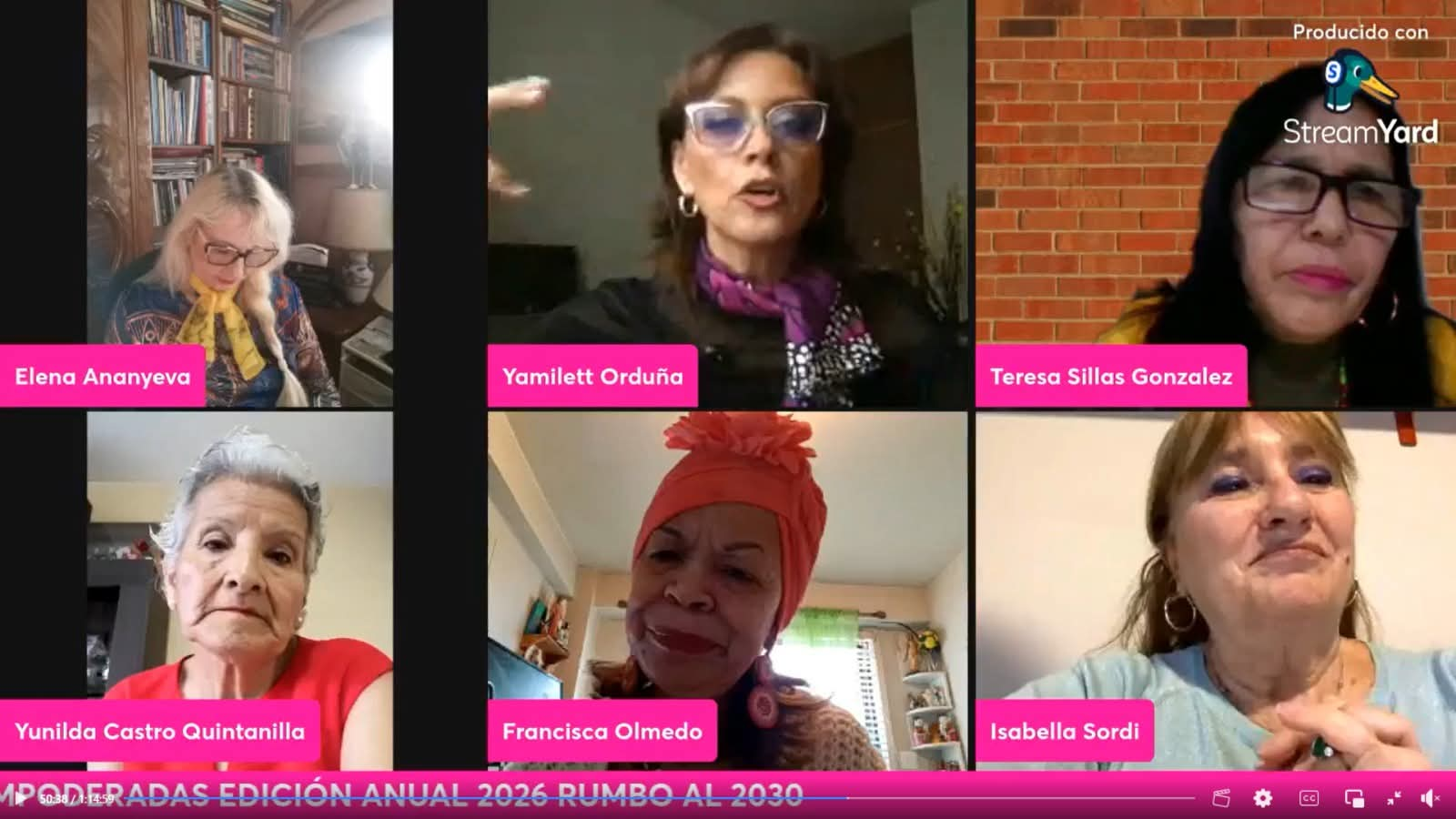 En calidad de dialogantes, se dieron cita, la Mtra. María Isabel Avelar Hinojosa (Estados Unidos/México) escritora y conferencista; Dra. Teresa Sillas González (México): Fundadora de IMIARI y Gran Consejera de Vive Mejor Ciudadano A.C. Capítulo Global; Mtra. Yunilda Castro Quintanilla (Perú): Embajadora por la Paz de la Universal Peace Federation; Mtra. Elena Anayeva (Alemania): Presidenta de CIESART Alemania, así como la Mtra. Isabella Sordi (Italia) escritora vinculada a la comunidad cultural europea, así como Francisca Olmedo Rosario, escritora y editora, dominicano neoyorquina.